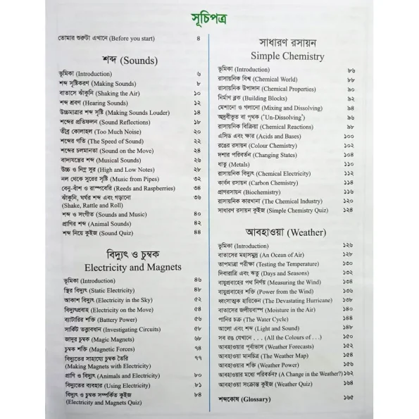 মজার মজার সাইন্স এক্সপেরিমেন্ট By শাহরিয়াজ সরকার বইয়ের প্রথম অংশের এক্সপেরিমেন্টগুলাে আপনাকে শব্দের সৃষ্টি ও আপনার কান কিভাবে শব্দ শুনতে পায়, তা বুঝতে সাহায্য করবে। এই বইয়ের দ্বিতীয় অংশের এক্সপেরিমেন্টগুলাে থেকে আপনি ধারণা অর্জন করতে পারবে যে, কিভাবে বাদ্যযন্ত্র থেকে শব্দের উৎপত্তি হয় এবং ঢােল, ইলাস্টিক ব্যান্ড গিটার, কাচের তৈরি জাইলােফোন, | নলাকার ঘণ্টা, একটি প্যাকিং বাক্সের মধ্যে সৃষ্ট সুর এবং একটি এক তারা ব্যাঞ্জোর মতাে খুব সাধারণ বাদ্যযন্ত্র থেকে কিভাবে বিভিন্ন ধরনের ছন্দময় | শব্দের উৎপত্তি হয়। পরের আংশে পাবেন বিদ্যুৎ ও চুম্বক কিভাবে কাজ করে ও তাদের এক্সপেরিমেন্ট। তার পরের অংশে আছে রসায়ন নিয়ে বিভিন্ন এক্সপেরিমেন্ট এবং শেষের অংশে আছে আবহাওয়া বিষয়ক নানান এক্সপেরিমেন্ট।