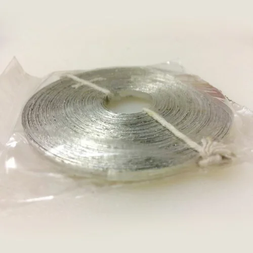 This magnesium ribbon is about 0.01″ (0.25 mm) thick and 0.125″ (3 mm) wide. You get a 25 g roll, which is over 50 feet in length.