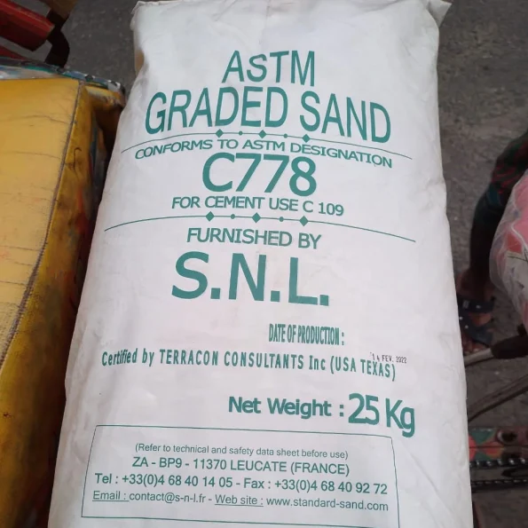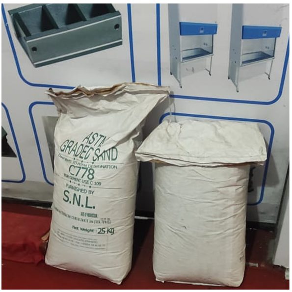 Graded sand is made of local (French Source) natural silica sand (silica content 99 %), having a water content lower than 0.1 %. The constituent grains of this sand are uncrushed and of rounded form. It is packaged in bags of 25 kg. The sand is used for testing of hydraulic cement strength conforming to ASTM C 109.