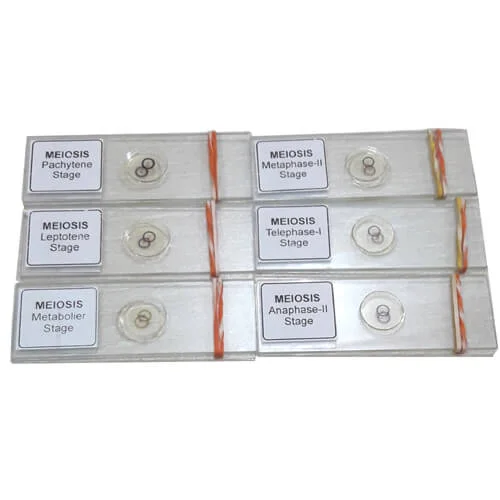 Meiosis Permanent Slide 12 Pcs per Set without Box. Made in India. This set of 12 prepared slides will help students to visualize and understand different stages of meiosis properly. These are the microscopic Slide (Meiosis Permanent Slides) ideal for Biology or Zoology Educational Purposes.