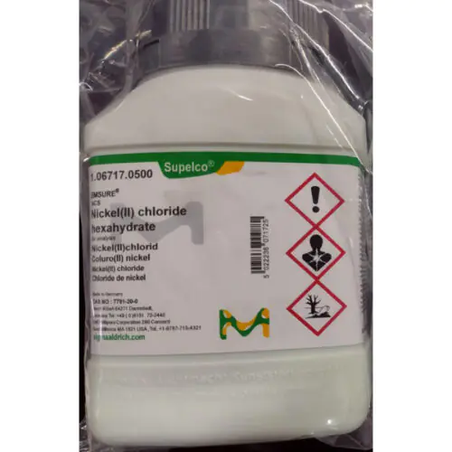 Nickel Chloride Hexahydrate (NiCl₂·6H₂O) is a green crystalline solid commonly used in electroplating, as a catalyst, and to prepare other nickel compounds. The 500g Merck version provides a high-purity reagent suitable for scientific and research applications. Scientists use it in the synthesis of nickel-based catalysts and various chemical processes. Due to its toxicity and corrosive nature, it requires careful handling.